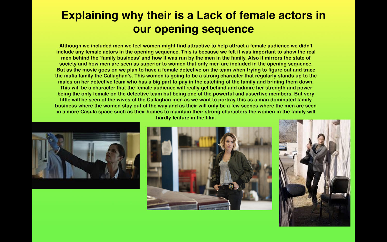 From our earlier research based on the target audience of similar films to ours such as Goodfellas and the Godfather we discovered that most of our target audience will be male and between the ages of 23-29.